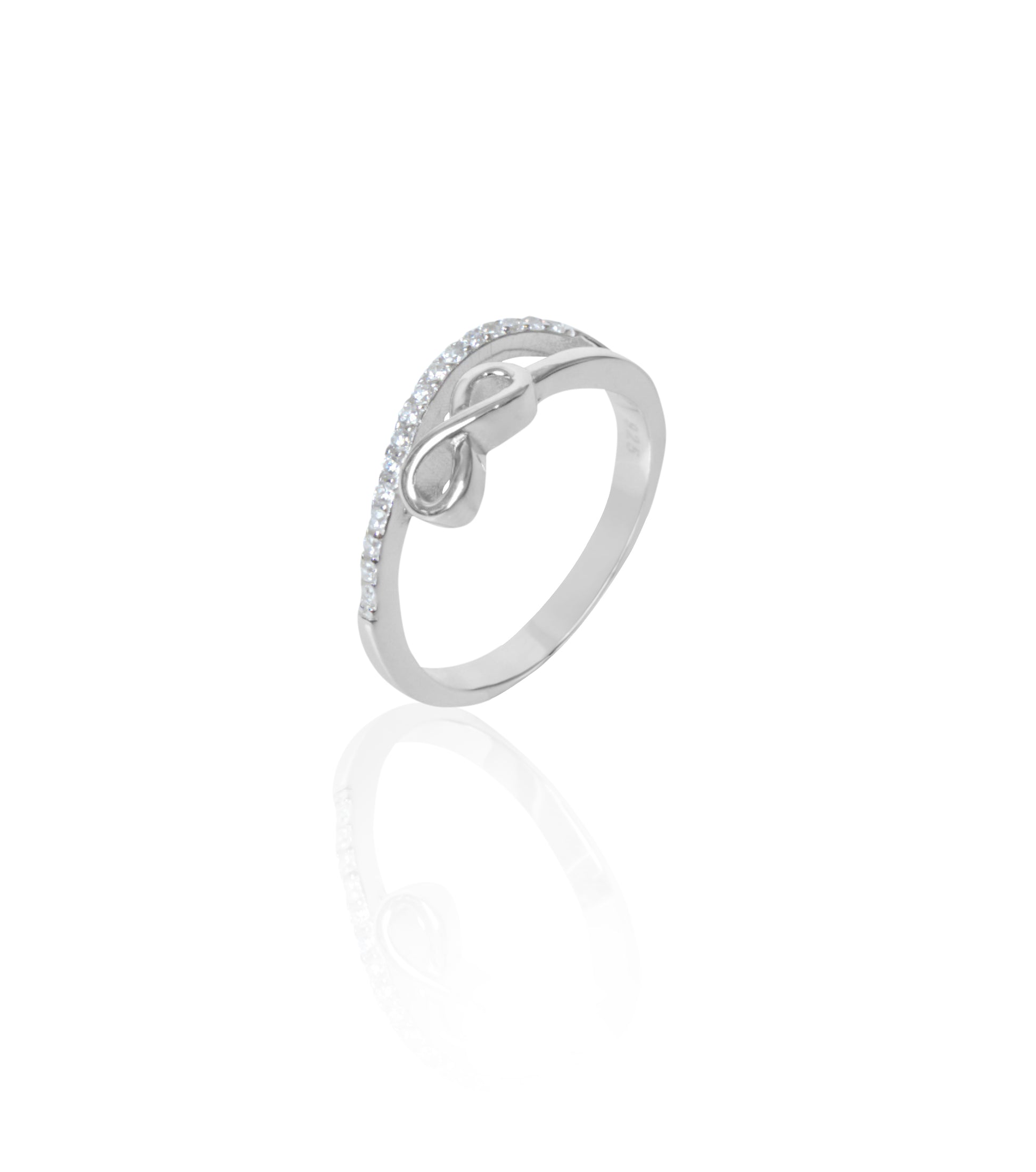 Elevate your style with the Silverio Sterling Silver Infinity Loop Ring. This elegant piece features a graceful infinity loop design, symbolizing eternal love and commitment. Crafted from high-quality 925 sterling silver, the ring is adorned with a delicate row of sparkling cubic zirconia stones, adding a touch of brilliance to its sleek, polished finish. Perfect for everyday wear or special occasions, this timeless design makes a beautiful gift or a chic addition to your personal jewelry collection.